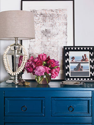Love the blue shades matching the painting, zebra print, stick candles and the stools